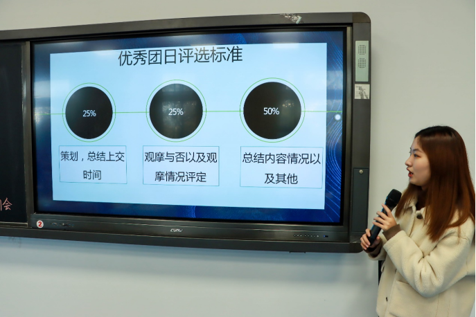 视频结束,校团委组织部活动管理中心副主任杨玥上台,对团日活动相关工作展开了培训。培训分为四个板块,分别是团日活动开展、团日活动总结撰写、优秀团日活动评选标准以及团日标兵评选标准。