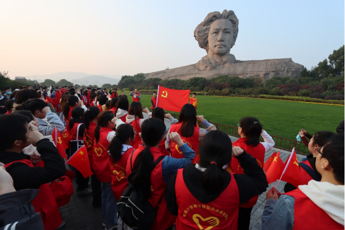 经过将近两个小时的徒步走,师生们到达橘子洲。短暂休息后,师生们前往毛主席像处进行参观。在这里,党员们重温了入党誓词,庄严地进行宣誓,严肃认真的神情诉说着不忘初心、牢记使命的决心。