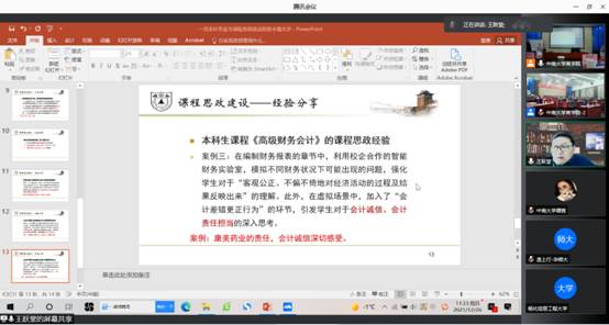 研讨会第二项为会计学专业经理(系主任)讨论交流,由会计与财务系修宗峰副教授主持。讨论交流会期间,龚光明教授结合王跃强教授讲的经验浅谈了个人课程思政教学的经验,期间,各位老师相互探讨教学思政经验,气氛十分活跃。