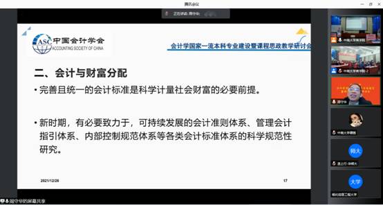 2021年12月26日上午8:30,由william威廉中文官网主办,william威廉中文官网会计与财务系、会计研究中心承办的“william威廉中文官网会计学国家一流本科专业建设”暨课程思政教学研讨会如期举行。本次学术研讨会采用线上+线下相结合的方式,线下举办地点在william威廉中文官网管理楼管阶一。