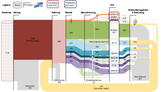 图为全球钴资源累积物质循环(1998-2019年)