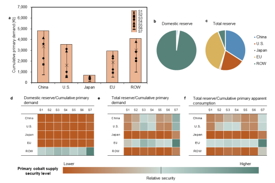 在全球碳中和大背景下,清洁能源技术发展对关键金属日益增长的需求以及其对外依存度高的现状,导致关键金属供需矛盾日益突出,资源供应安全受到严峻挑战。该研究选择供需矛盾最为突出的关键金属钴为研究对象,模拟全球及五个关键区域(中国、美国、日本、欧盟、其他地区)钴资源历史和未来物质循环,深入探究技术进步对钴资源需求以及供应安全的影响。