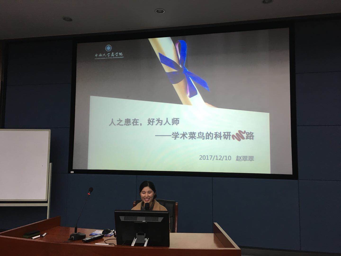 讲座中,赵依妮同学和赵翠翠同学图文并茂地为大家分享了学术经验。每位讲座参与者都意识到做科研需要具备不怕吃苦、攻坚克难的学术精神,只有耐得住寂寞才能在学术领域绽放出最灿烂的花朵。最后,在一片热烈的掌声中,讲座圆满结束。(文/任冰玉)