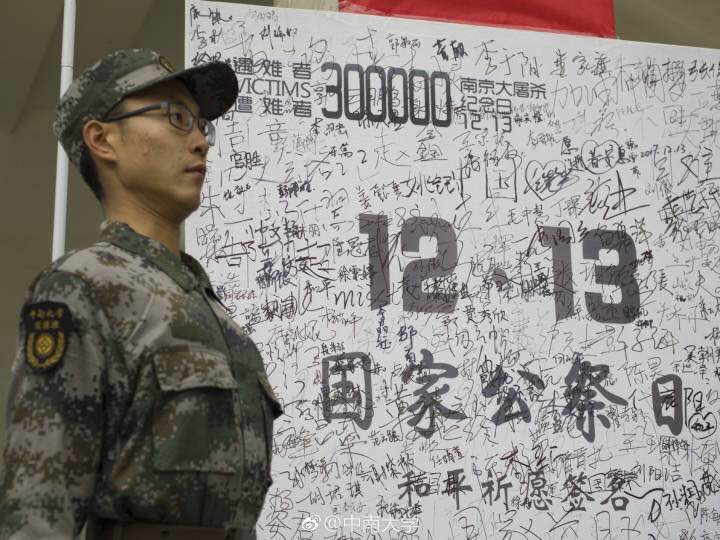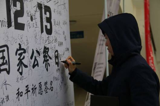 中午时分,国旗班成员在南校区二食堂门前竖立起祈愿签留言名板,组织祈愿签名及“烛光祭”志愿者招募活动。过路学子纷纷前来参与,笔笔燃情,字字铿锵:“昭昭前事,惕惕后人”,“勿忘国耻,吾辈自强”,“愿世界和平”,“三十万人,回家了”……签名墙上 ,记录下了中南学子对和平的深切热爱,对死难同胞的深切缅怀。