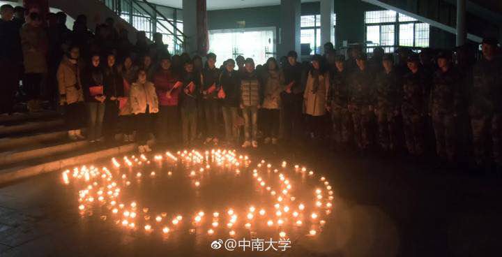 夜幕降临,“烛光祭”活动分别在在校本部升旗台和南校区升华公寓展开,现场300余名志愿者用燃烛筑爱心,摆放成“南京 ”、“12·13”等字样,并围站成爱心轮廓,手捧燃烛,沉痛默哀,汇小爱成大义,告慰逝者魂灵。