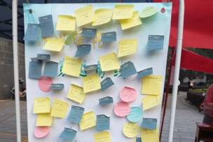 一张张小纸片,书写着同学们认真的心事,一笔一划皆是情。在“你的烦恼我来帮”的环节,抽取到便利贴的同学,亦尽力帮助写心愿的同学实现小小心愿。就这样,一张纸片、一个联系方式、简简单单的问候与关怀,不认识到认识,陌路走向友情。