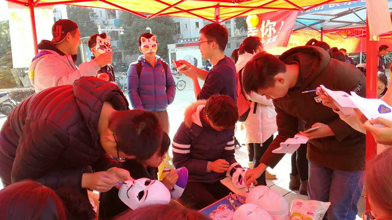 寒冷的冬日,一场匿名的面具狂欢点燃了同学们的激情,“彩绘面具”环节不限主题、不限内容的游戏设定,让心中有画、心中有情的同学们纷纷拿起画具,挥毫泼墨,创作出属于自己的面具。制作完成的同学们迫不及待地带上独一无二的面具,与三两好友、工作人员或是新结识的小伙伴合影留念,脸上洋溢的微笑温暖了这片寒冬。
