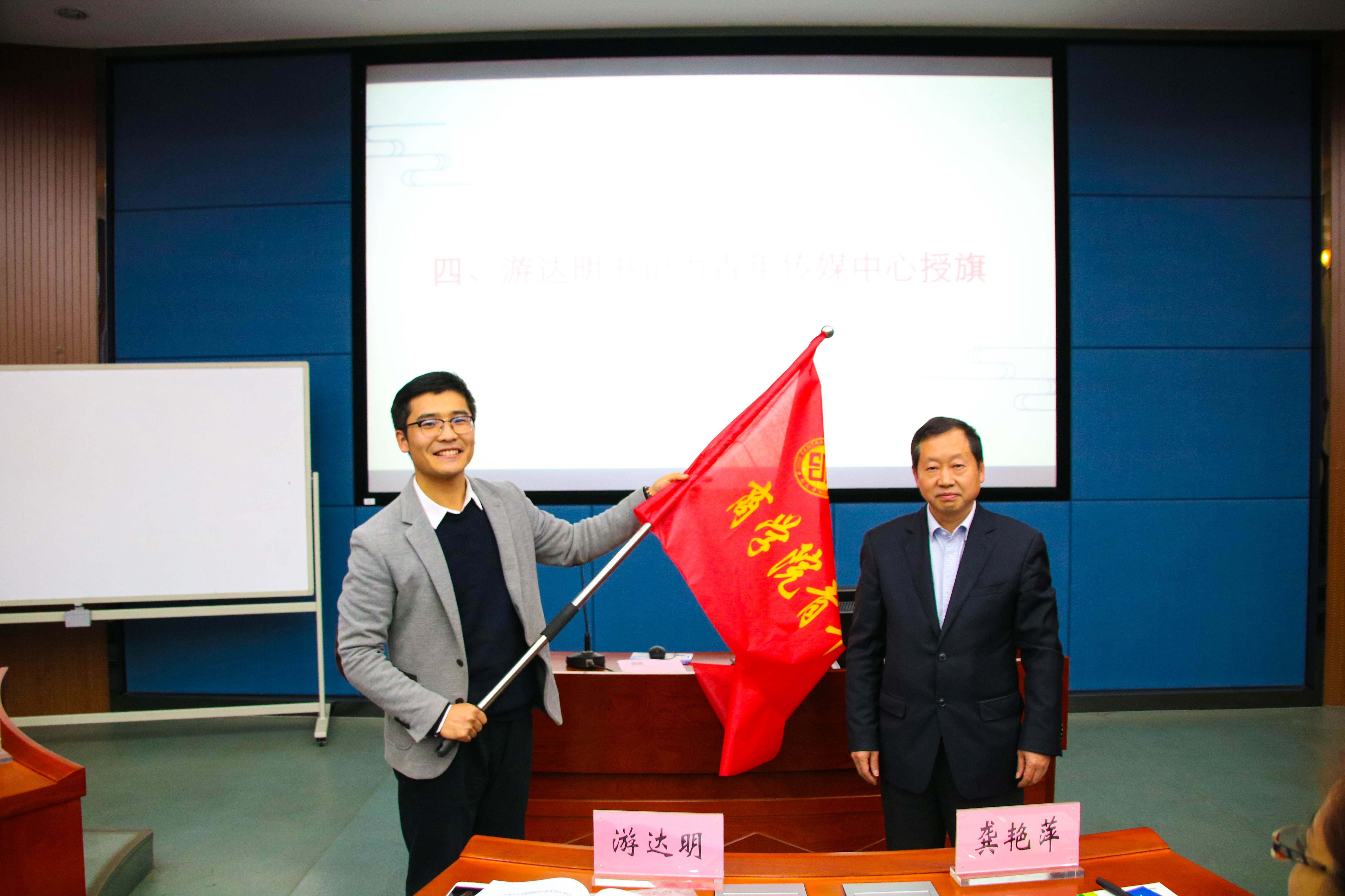 大会伊始,全体人员起立奏唱国歌。在参会人员介绍完毕后,李华东副书记宣读了青年传媒中心干部名单,游达明书记向青年传媒中心负责老师杨鑫山授旗,随后,龚艳萍经理、王宗润副经理亲自为青年传媒中心主要干部颁发了聘书。