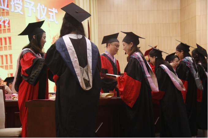最后,毕业生们身着学位服有序上台,从学院领导和导师们手中郑重接过学位证书,老师们为他们拨穗,祝贺他们顺利毕业。