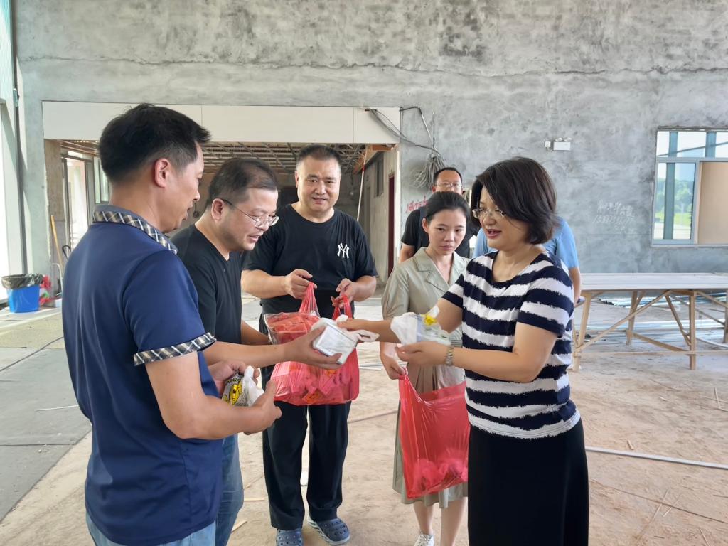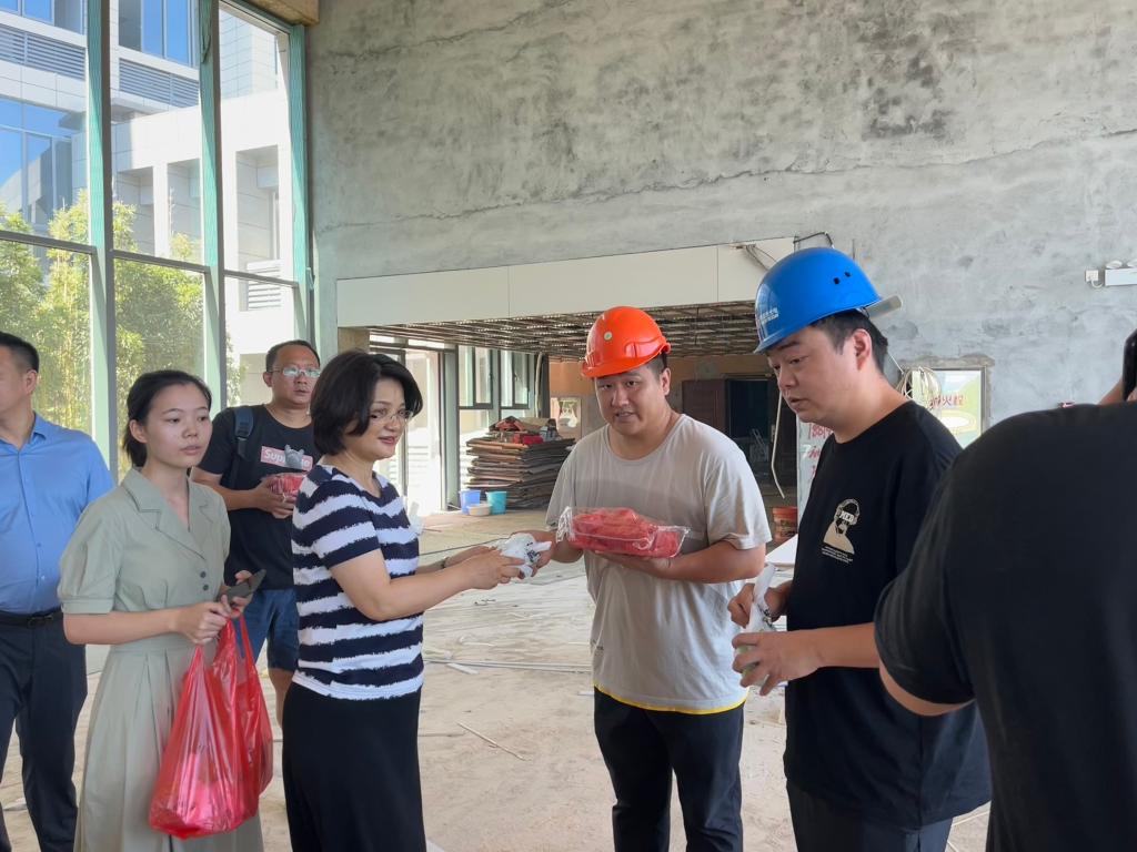 7月27日上午,龚艳萍经理到江湾楼装修项目施工现场了解工程进展情况,看望慰问高温下坚守一线的施工人员,给他们送去西瓜、风油精、人丹、藿香正气水等防暑降温慰问品。