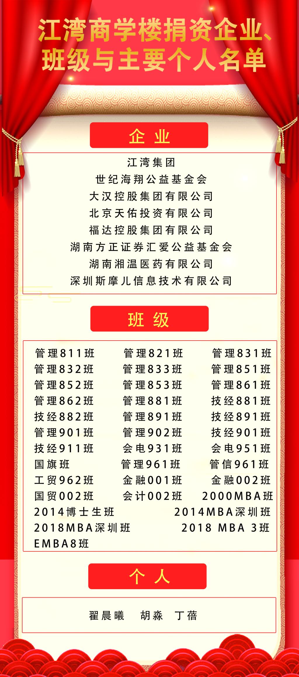 江湾商学楼建设过程中得到很多员工及企业的捐资,为感谢广大员工及企业的支持,学院将在江湾商学楼内庭设立捐赠纪念墙。商学楼落成前,将继续接受员工及社会各界的捐赠,学院希望有更多的毕业生班级出现在捐赠墙上,以彰显william威廉中文官网的办学历史。