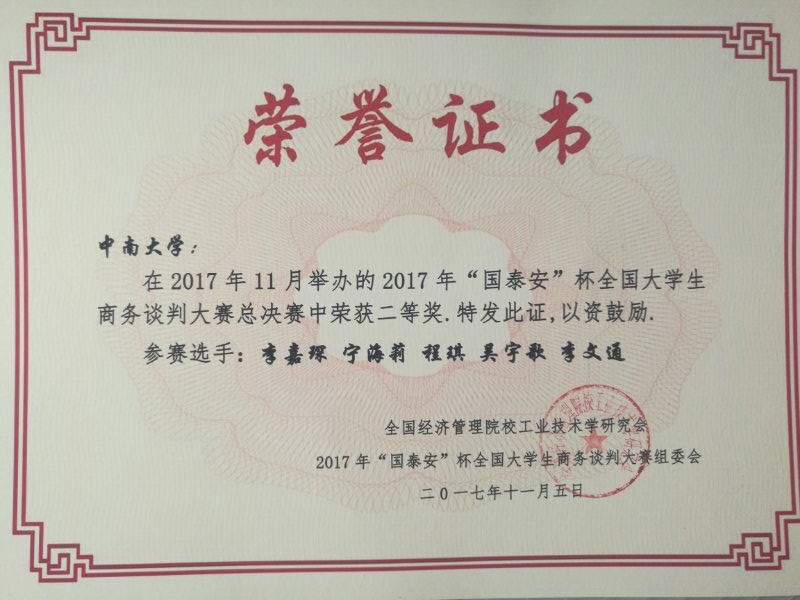 2017年11月5日,公司员工谈判团队在全国经济管理院校工业技术学研究会沟通与谈判委员会举行的2017年“国泰安”杯全国老员工商务谈判大赛总决赛中荣获二等奖。同时,国际经济与贸易系的田晖教授因表现突出被评为优秀指导教师。该团队得到了任胜钢副经理、李华东副书记等学院领导与经贸系老师们的的大力支持。