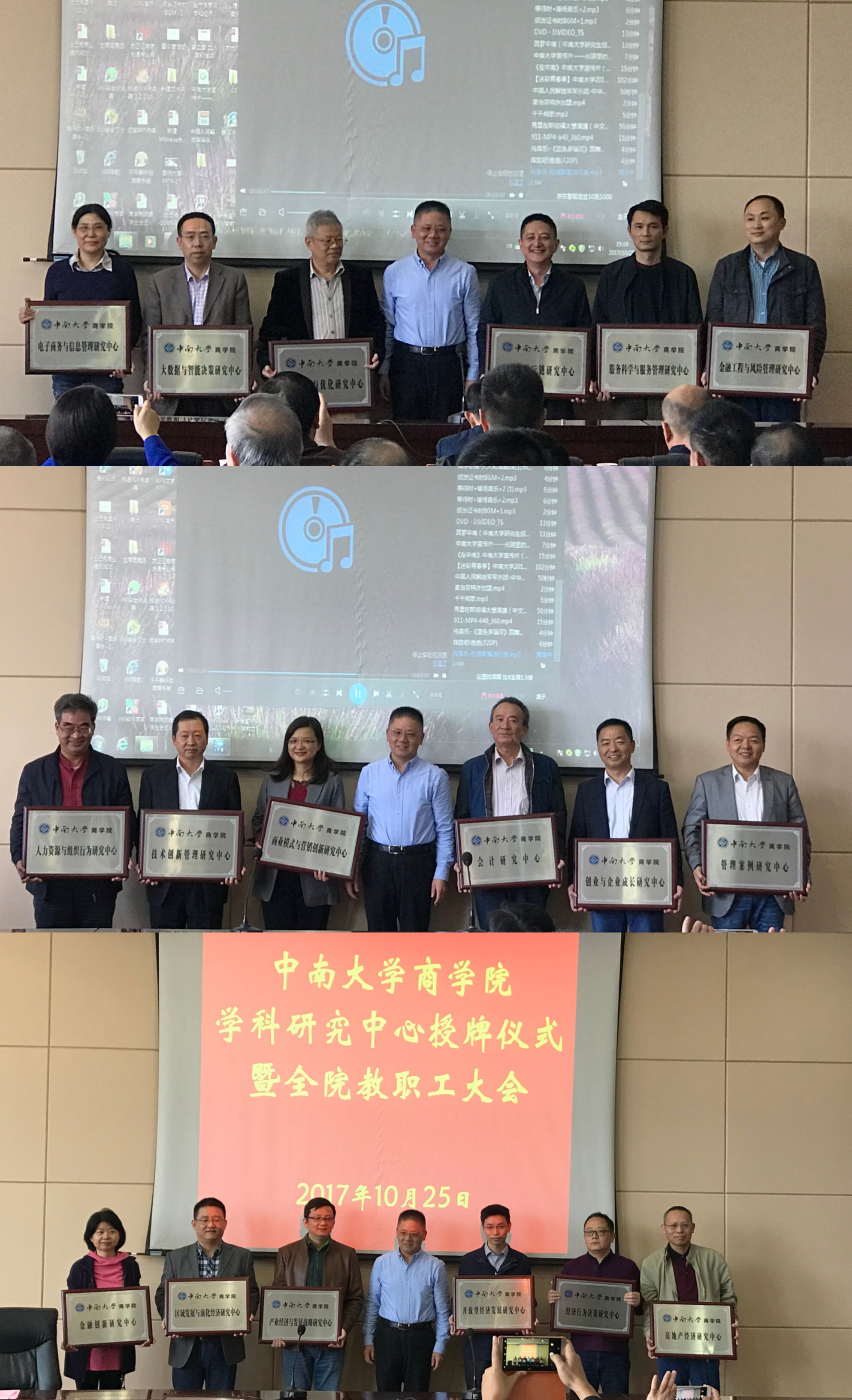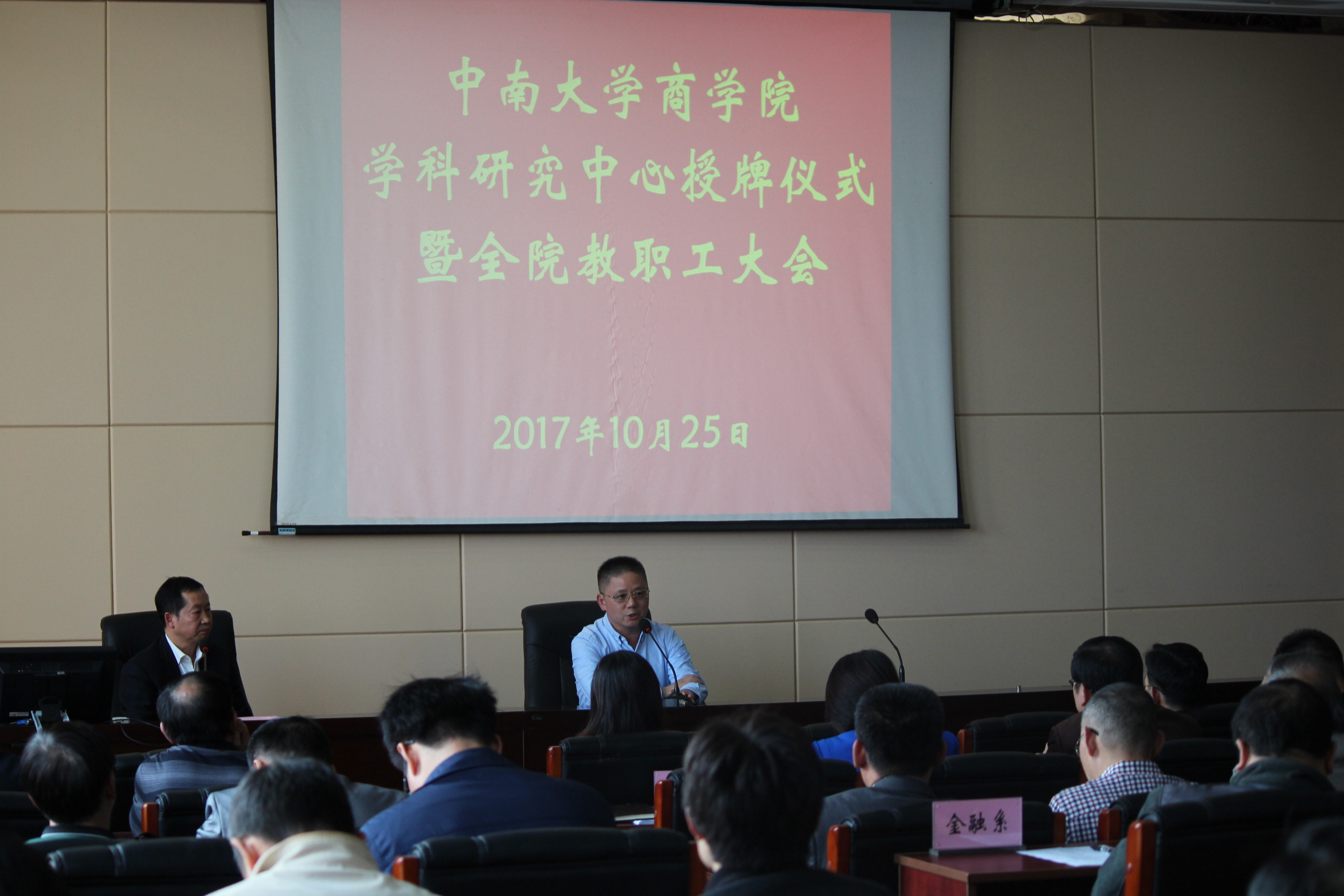授牌仪式结束后,随即召开院教职工大会。会上,游达明书记对完善公司党建工作机制作了部署,并对部分党支部换届情况作了详细说明;李华东副书记强调了员工安全及研究生导师制的重要性;任胜钢副经理对学院本科教学工作目标及重点作了介绍;王宗润副经理结合学院文件强调,学院鼓励并全额资助教师参加国内外相关学术会议,并支持以研究中心为单位举办会议;刘咏梅副经理和关健副经理相继就学院国内外专家引进、项目及职称申报管理办法进行了解释;毕文杰经理助理对学院高水平论文鼓励制度以及ESI经济学与商学论文发表的奖励办法作了说明。