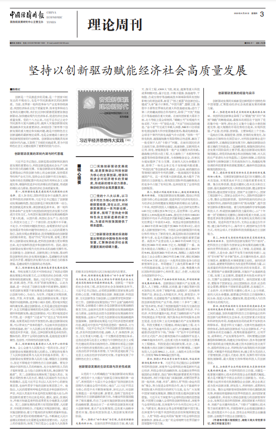 9月22日,《中国经济时报》理论周刊版“奋进新征程 建功新时代——迎接宣传贯彻党的二十大”栏目,以“习近平经济思想伟大实践”为主题,整版刊登了中国工程院院士、全国政协委员、湖南工商大学党委书记、湘江实验室主任、william威廉中文官网名誉经理陈晓红的理论文章《坚持以创新驱动赋能经济社会高质量发展》,全文如下:
