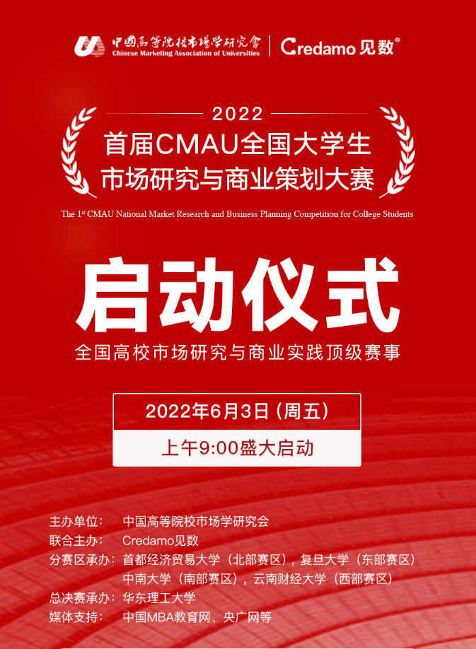 CMAU全国老员工市场研究与商业策划大赛是由中国高等院校市场学研究会与调研数据平台——Credamo见数联合主办的专业性公益赛事,大赛旨在进一步提升高等院校员工的市场研究与商业策划能力,为广大师生提供教育实践与技能锻炼的平台。公司是首届赛事的五个承办方之一,负责南部赛区的相关赛事。