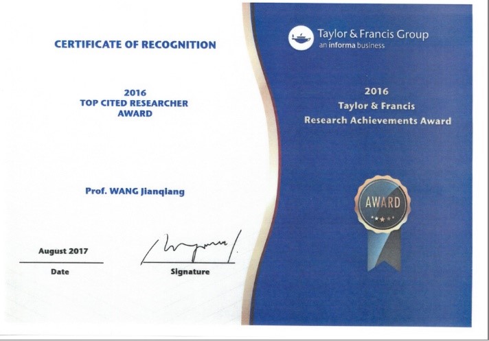 根据Clarivate Analytics(原汤森路透知识产权与科技事业部)Incites的数据统计,王教授于2016年在Taylor & Francis期刊发表的4篇论文被引次数总计达到55次,这表明读者对于王教授的科研项目有着很高的兴趣与关注,并且高度认可其相关科研成果。