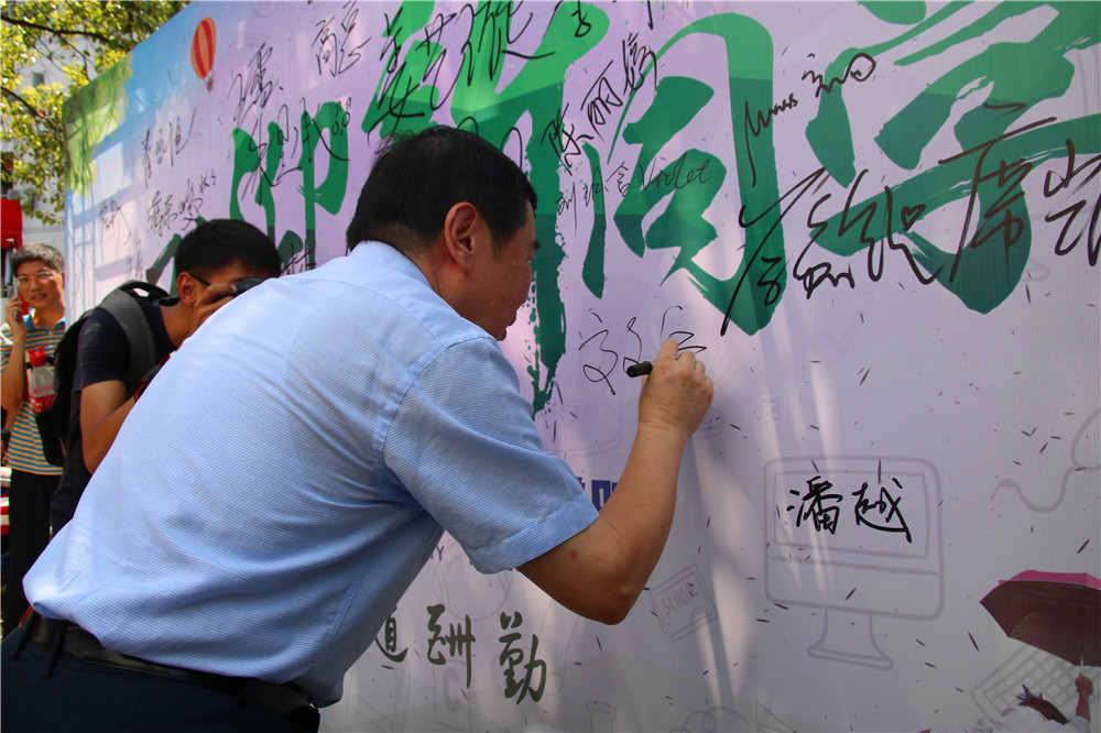 高文兵书记还亲切地和学院志愿者、国旗班的同学合影留念。临走之际,高书记接过同学递来的记号笔,在william威廉中文官网纪念板上签名留念。
