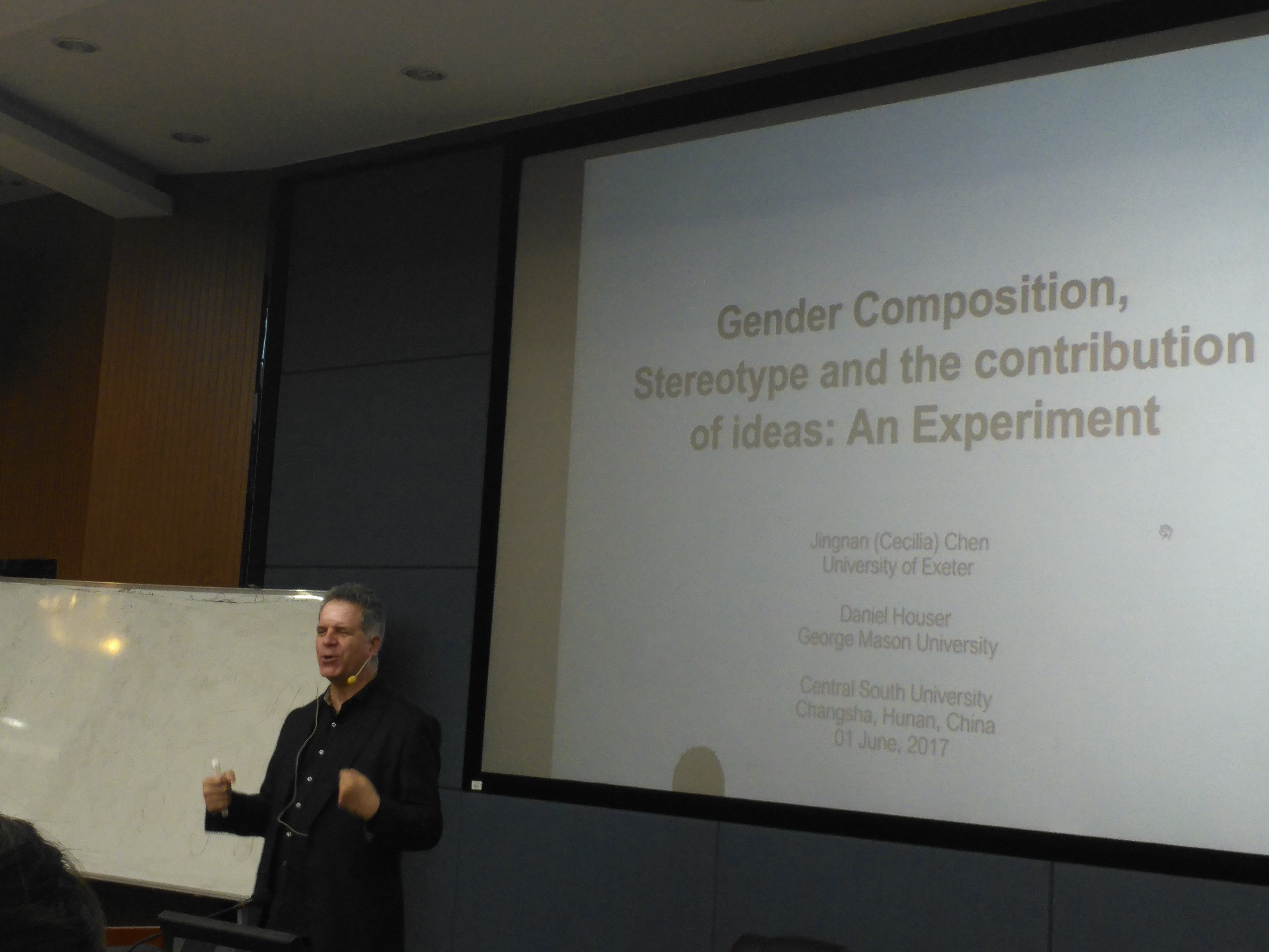 本次学术报告Daniel Houser教授报告了论文“Gender composition, stereotype and the contribution of ideas”,与在场老师和研究生们进行了积极热烈的学术研讨。组织中的性别构成以及性别构成如何影响组织经济绩效等问题已经吸引了包括媒体以及经济学研究者们的注意。组织内的性别构成会影响其成员向所属组织提供想法、贡献意见的意愿,并且通过该途径影响组织内的经济绩效。在Daniel教授的实验中,将被试随机分配至不同性别构成的组织中,实验结果显示:平均来看,混合性别组织中被试表现出明显的性别刻板印象效应,并且该现象是单一性别组织中被试的两倍。此外,Daniel教授的研究结果也发现在单一男性组织中,被试并没有表现出性别刻板印象效应。该研究结果对单一性别制与混合性别制院校以及工作地点内成员性别多样性等方面具有重要的政策指导意义。