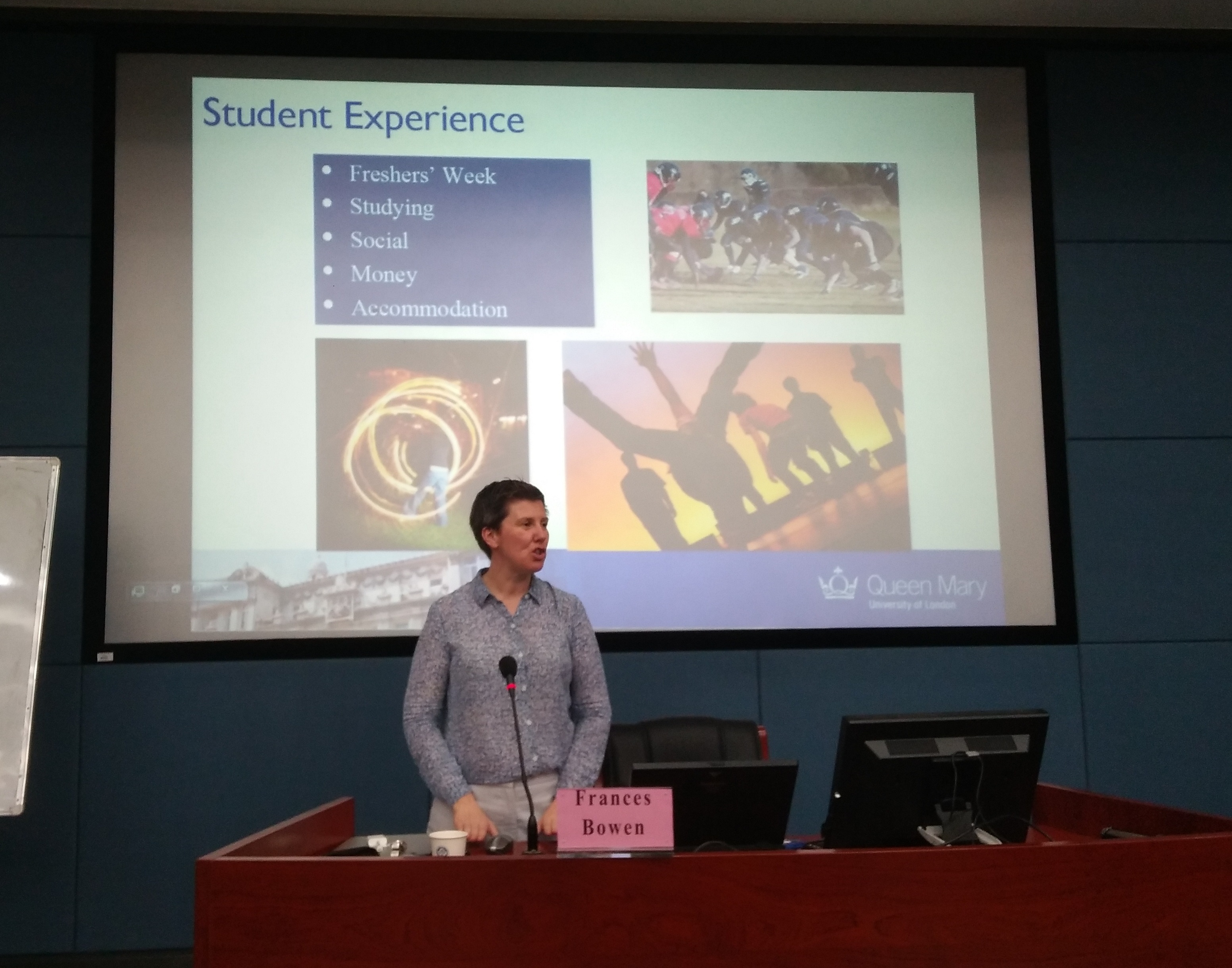 在第二个主题,Frances教授以英国的风土人情为开端,为我们展开了如何在英国学习的报告。Frances教授介绍了在英国的几类大学在建筑分布,规模大小和水平层次上的不同之处,以及英国大学中的课程安排和常见的课外活动,并且为我们介绍了玛丽女王大学悠久的历史背景及高国际化程度。