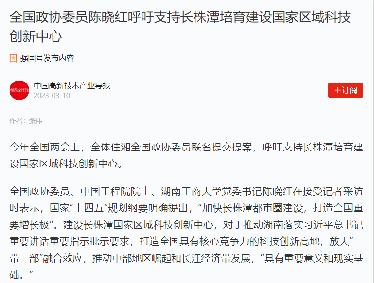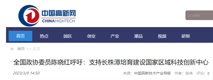 【学习强国】【中国高新网】全国政协委员陈晓红呼吁支持长株潭培育建设国家区域科技创新中心