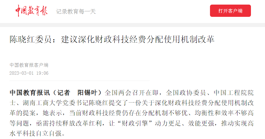 【中国教育报】陈晓红委员:建议深化财政科技经费分配使用机制改革