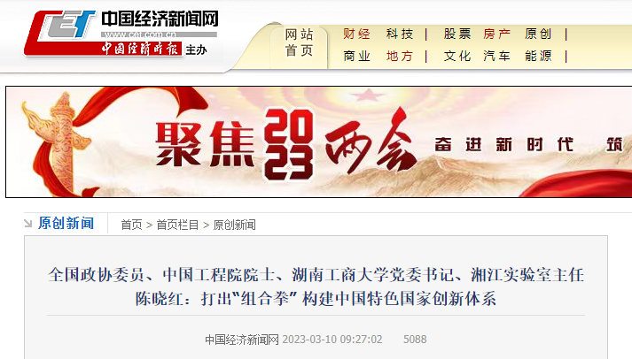 【中国经济时报】全国政协委员、中国工程院院士、湖南工商大学党委书记、湘江实验室主任陈晓红:打出“组合拳” 构建中国特色国家创新体系