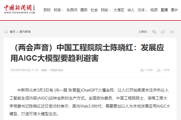 【学习强国 】【中国新闻网】中国工程院院士陈晓红:发展应用AIGC大模型要趋利避害