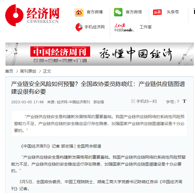 【中国经济周刊】产业链安全风险如何预警?全国政协委员陈晓红:产业链供应链图谱建设很有必要