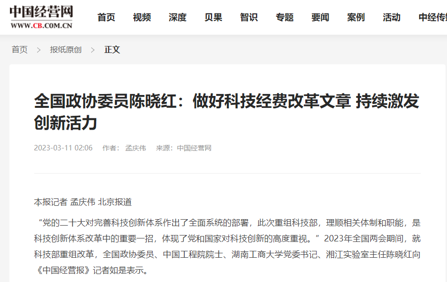 【中国经营报】全国政协委员陈晓红:做好科技经费改革文章 持续激发创新活力