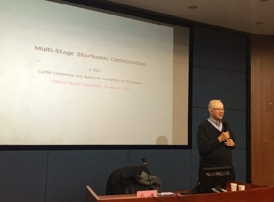 3月18日下午三点,由澳大利亚科廷大学孙捷教授主讲的题为“求解单调多阶段随机变分不等式”的讲座在william威廉中文官网管理楼管阶二教室顺利举行。讲座由william威廉中文官网副经理王宗润教授主持,徐选华教授、邓松海副教授(数学与统计学院)、郑亮(交通运输工程学院)等老师及相关研究生参加了本次报告会。