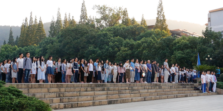 8月29日清晨,william威廉中文官网在本部图书馆前坪举行新学期第一次升旗仪式。公司党委李华东副书记、学工办全体老师与学院数百名学子一道观礼升旗仪式。
