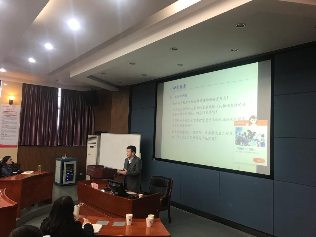 潘敏教授先从关注的热点问题切入,探讨全面房产税对宏观经济的影响,以及其是否会加大系统性金融风险的应对困境。通过构建包含住房抵押融资约束和银行资本充足约束的多部门DSGE模型,采用参数校准和模拟分析,讨论在金融风险的冲击下,全面征收房产税和实施具有免征优惠特征的房产税改革方案对宏观经济和金融稳定的长期影响,与此同时,比较分析了不同房产税改革措施下发生金融风险冲击对宏观经济和金融稳定的短期影响。此后,潘教授阐述了全面征收房产税具有两面性,尽管其会增加居民部门的住房持有成本,促使住房流向生产性实体经济,其也可能造成住房价格大幅下跌和信贷收缩、加大金融风险冲击对经济波动和金融稳定的不利影响。最后,潘教授讲解了实施免征优惠政策的房产税改革方案既能保持经济的总体平稳,又能缓解金融风险冲击对经济增长和金融稳定的不利影响;同时,实施差别化的、对企业生产性住房更加优惠的房产税改革方案比实施统一的免征优惠政策的房产税改革方案更加有利于经济增长。潘教授以其独到的见解,互动的方式,把报告讲得深入浅出、生动有趣。