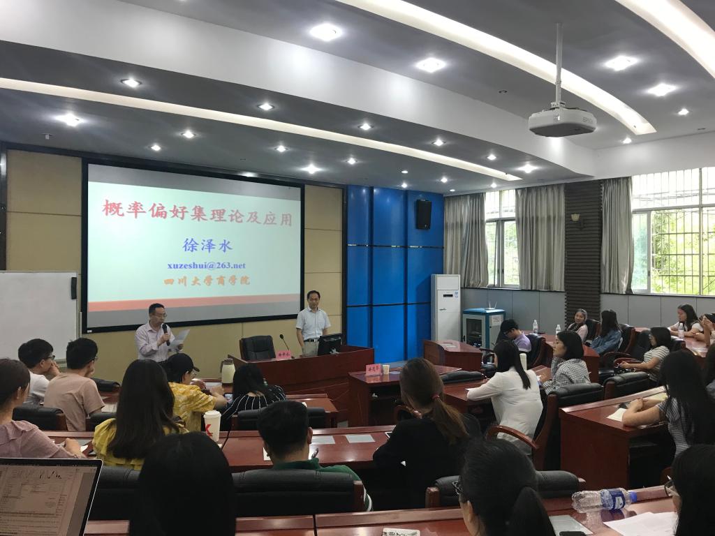 2019年5月29日下午,四川大学徐泽水教授在管理楼管阶一教室开展题为《概率偏好决策理论及应用》的学术讲座。讲座由徐选华教授主持,周艳菊教授、孟凡永教授等相关教师及研究生参加了本次讲座。