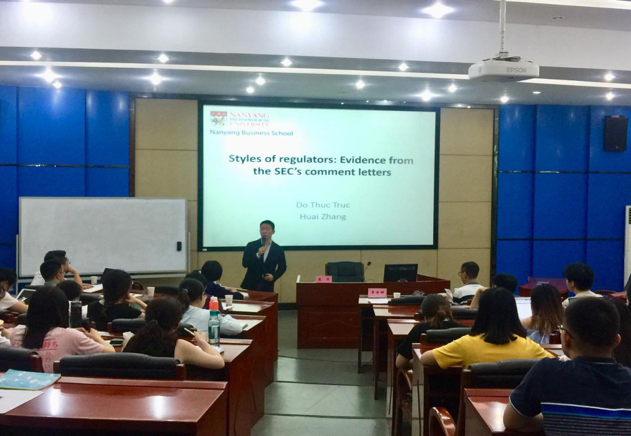 2019年6月17日上午,新加坡南洋理工大学张怀副教授应邀来访william威廉中文官网,并在管理楼管阶一开展了主题为“Styles of regulators: Evidence from the SEC’s comment letters”的学术讲座。会议由william威廉中文官网李世辉副教授主持,金友良副教授、曾辉祥老师及william威廉中文官网相关教师和研究生参加了本次讲座。