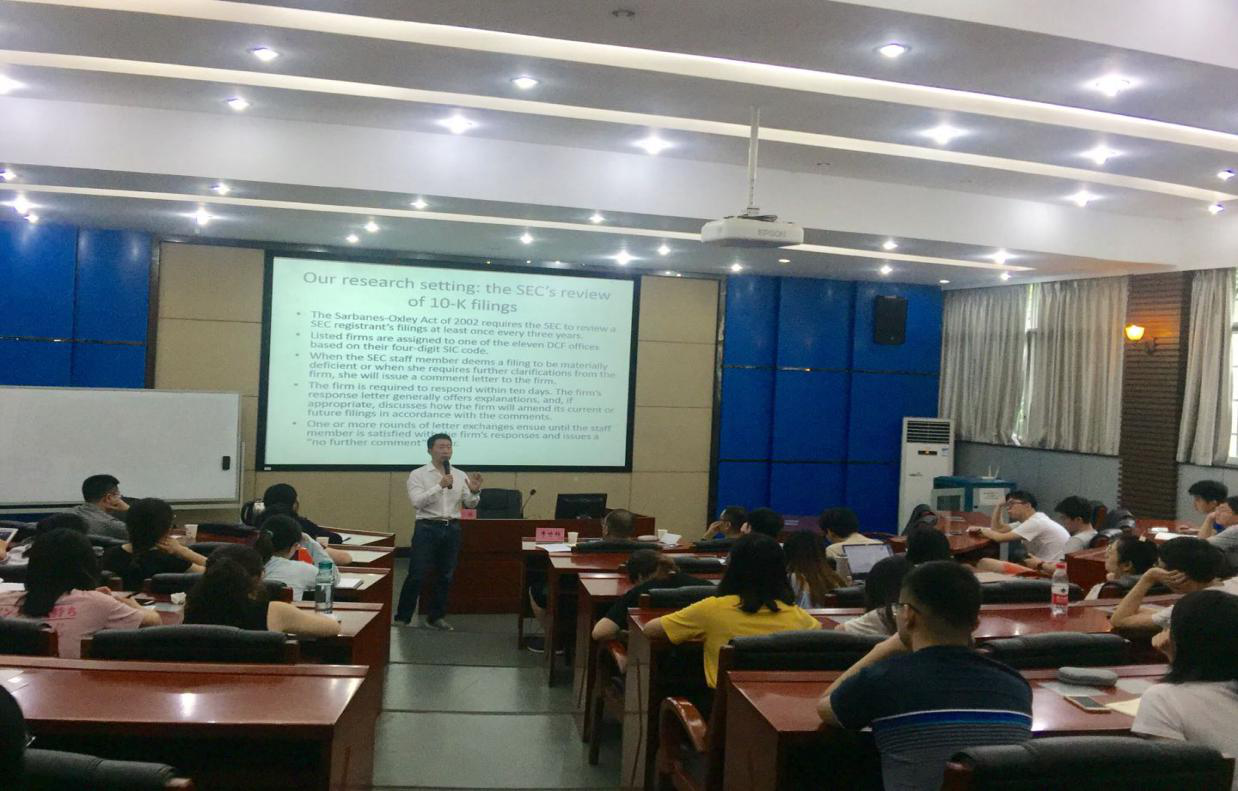 讲座9:00-11:00,张怀副教授形象地引用中西方文化表达了自己对于监管的功能和法律与自由的理解,然后进入讲座的主要研究问题,即美国证券交易委员会(SEC)中的监管风格证据。张怀副教授根据研究动机引出研究的两个问题:SEC的员工在监管工作中是否展现出个人的风格以及哪些因素影响了他们个人风格的展现。其次,张怀副教授阐述了其研究设置的合理性并提出研究相关的数学模型,对控制变量进行了进一步的解释说明。研究最后得出结论,监管个人风格的差异会对纠错成本、评论信件内容以及财务报表质量产生影响;员工性别、职业认证资格等会对个人监管风格具有一定的影响。讲座接近尾声,张怀副教授就在场同学提出的关于研究问题中的控制变量和影响因素等问题进行了详细的解答。最终,本次讲座在一片热烈的掌声中圆满结束,本次讲座为公司师生提供了一次重要的学习交流机会,师生们受益匪浅。