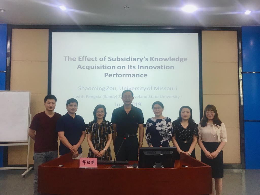 6月26日上午10点,邹绍明教授应邀在管理楼管阶一会议室开展了主题为“The Effect of Subsidiary's Knowledge Acquisition on It's Innovation Performance”的学术讲座。讲座由谢菊兰老师主持,经理龚艳萍教授、副经理刘咏梅教授、副经理关健教授、副经理李大元教授、戴国斌副教授及多位教师和研究生参加。在此次讲座中,邹绍明教授介绍了在国际市场中子公司的知识获取行为将如何影响其创新绩效。该研究的最大亮点在于将子公司进行自主学习获取创新知识储备的动机和行为进行了重新定义,区分探索型导向和开发型导向对子公司自主创新的不同影响。这一创新思维突破了传统的通过探讨边界来解释差异的固有范式,另辟蹊径从概念的重新定义着手,为广大研究生如何进行创新性的研究具有重大启示。最后,邹绍明教授针对在座师生提出的疑问进行了详细的解答,现场展开了热烈地讨论,参与者收获颇多。本次讲座为公司师生提供了一次重要的学习交流机会,为老师和员工开展具有理论创新的研究提供了新的思路。