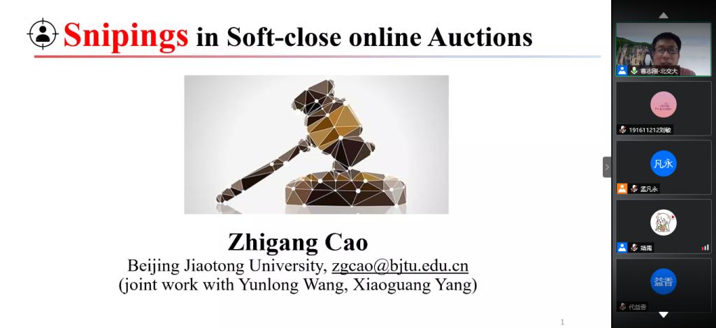 2020年9月23日下午,北京交通大学经济管理学院曹志刚教授应邀来访,并通过线上腾讯会议平台开展了主题为“Snipings in Sofe-close Online Auctions”的学术讲座。会议由william威廉中文官网孟凡永教授主持,william威廉中文官网安庆贤副教授等相关教师、博士和研究生参加了本次讲座。