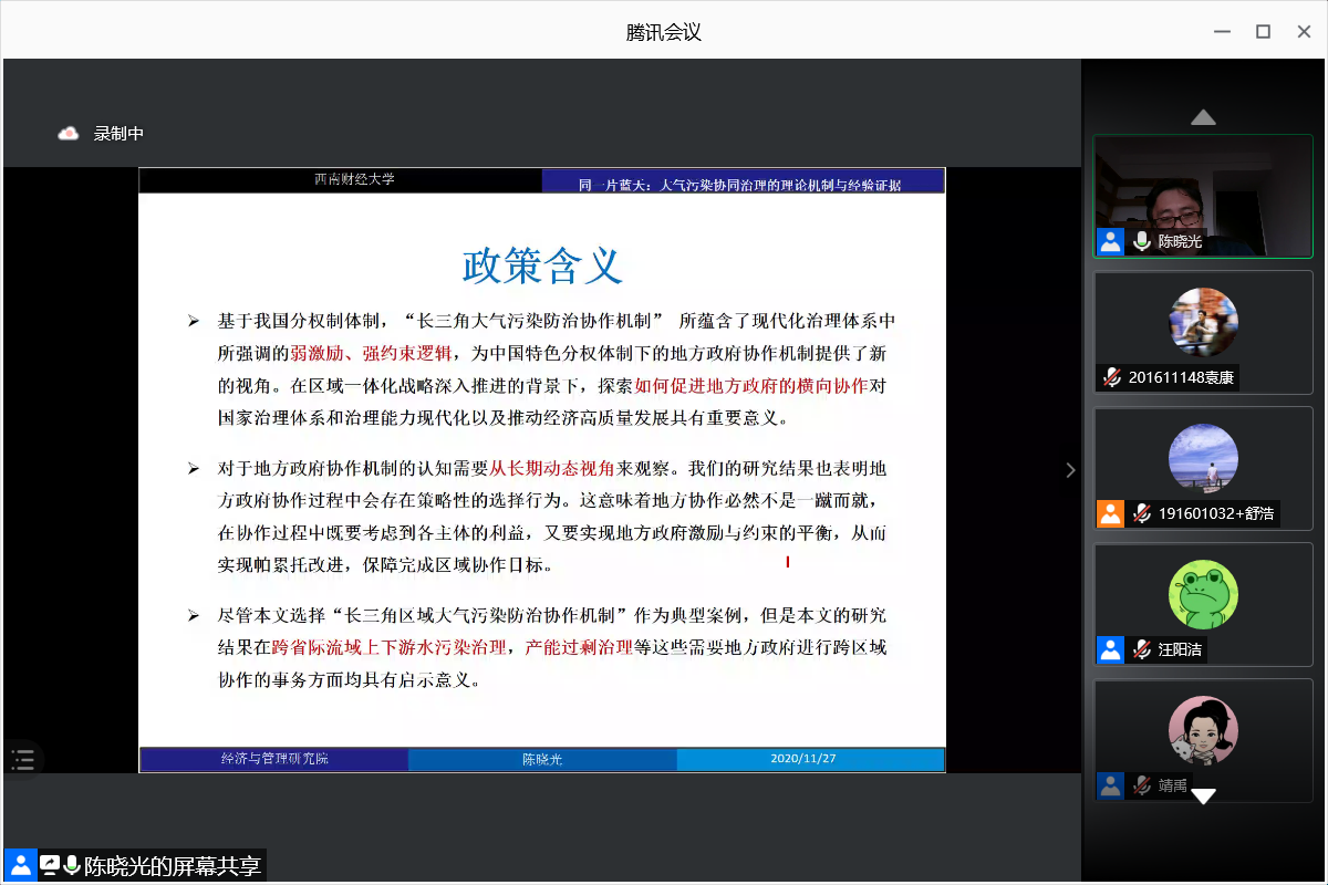 2020年11月27日上午,西南财经大学经济与管理研究院陈晓光教授受邀通过线上讲座平台开展了主题为 “同一片蓝天:大气污染协同治理的理论机制与经验证据”的学术讲座。会议由公司党委书记任胜钢教授主持,汪阳洁教授、强宏杰老师等william威廉中文官网相关教师和研究生参加了本次讲座。