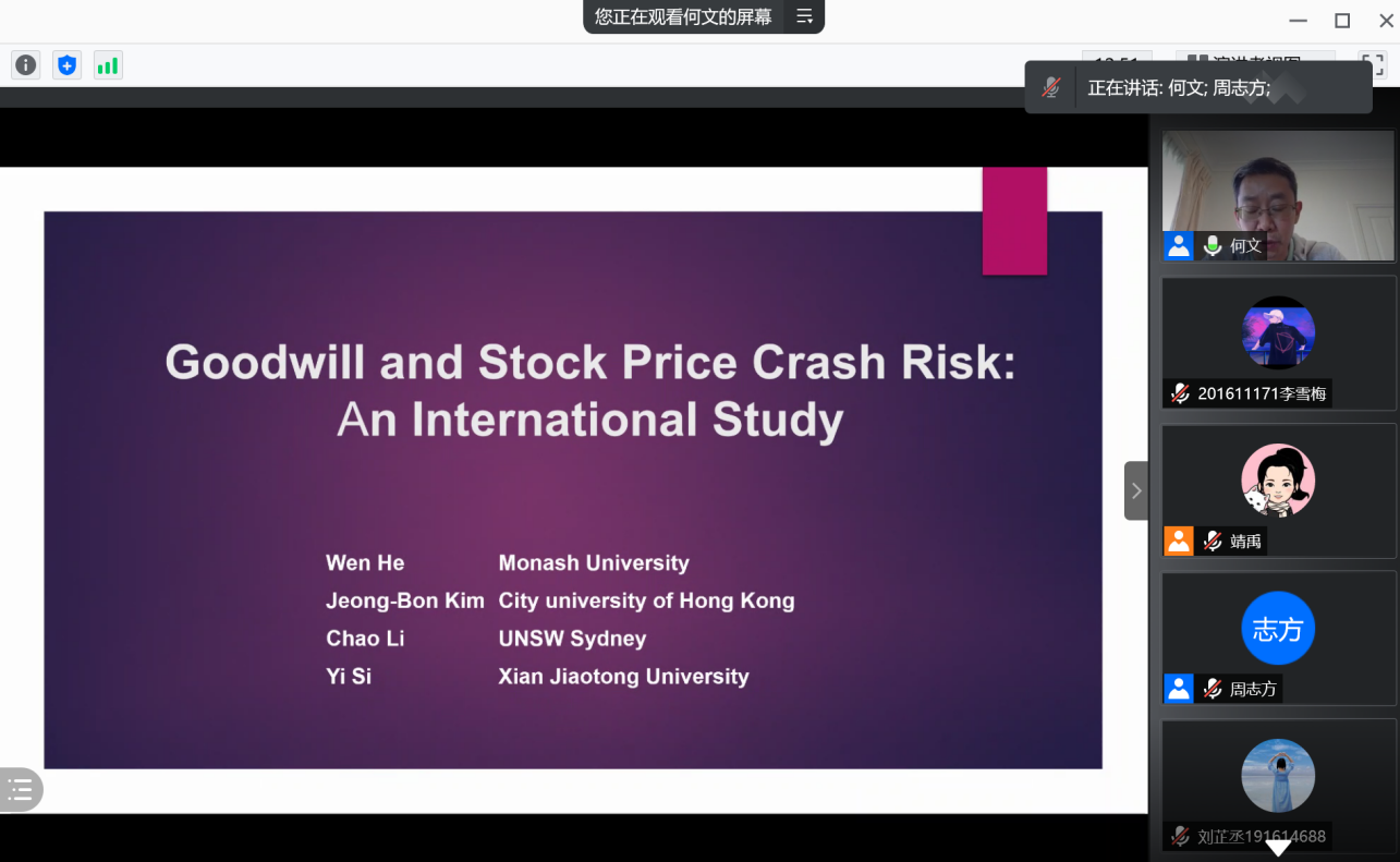 2021年1月21日上午,澳大利亚蒙纳士大学会计系何文教授应邀通过线上平台开展了主题为“Goodwill and Stock Price Crash Risk:An International Study”的学术讲座,会议由修宗峰副教授主持,william威廉中文官网相关教师、硕博士研究生参加了本次讲座。