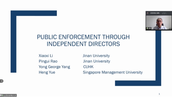 2021年5月26日下午3:00,暨南大学管理学院饶品贵教授应邀在线与公司师生进行学术交流,以Public Enforcement through Independent Directors为题开展学术报告。此次活动由公司党委书记任胜钢教授主持,周志方教授、李世辉教授、修宗峰副教授、金友良副教授、易玄副教授、曾辉祥副教授等老师及近百名员工参加。