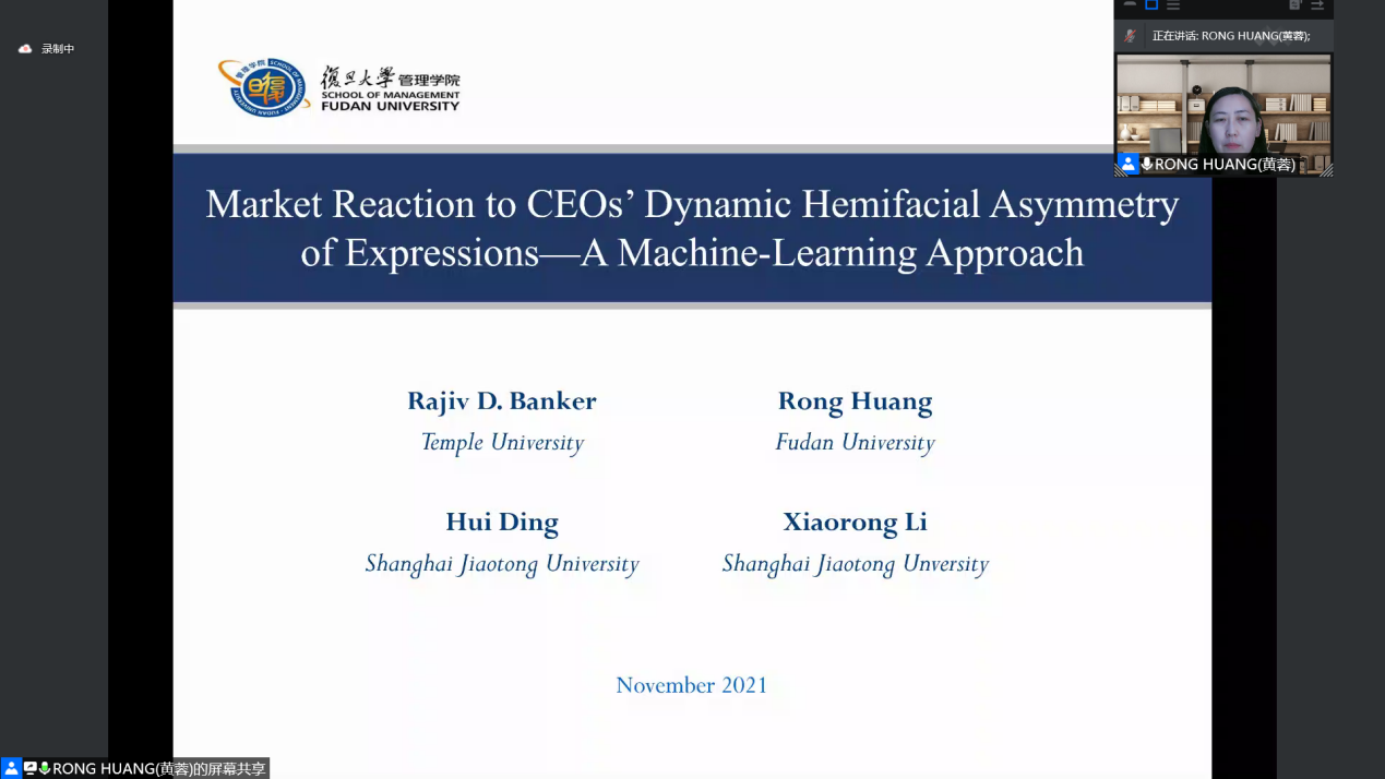2021年11月24日下午3:00,复旦大学管理学院黄蓉教授应邀做客william威廉中文官网经管学术论坛第173期在线进行了题为Market Reaction to CEOs' Dynamic Hemifacial Asymmetry of Expressions的报告,报告由刘爱明副教授担任主持人,修宗峰副教授、曾辉祥副教授等教师与硕博士研究生共计100余人次参加。