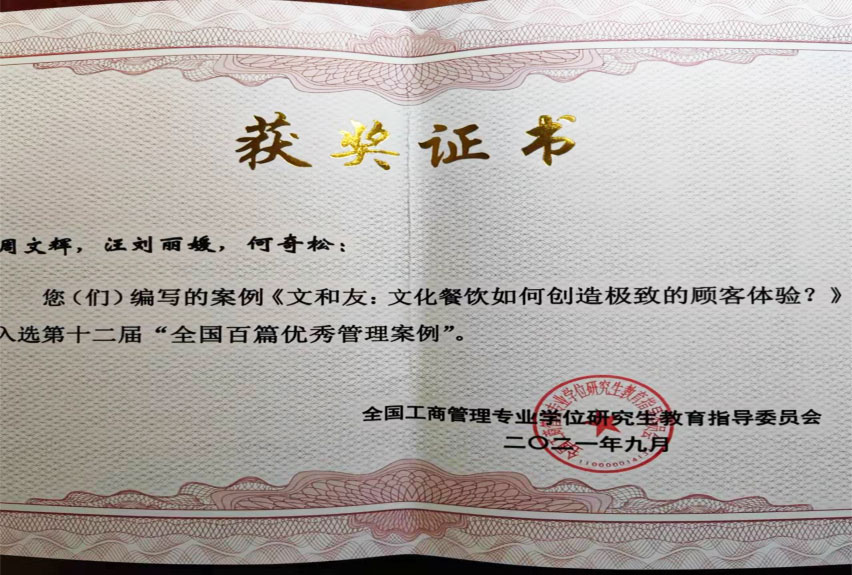 2021年9月10日,全国工商管理专业学位研究生教育指导委员会、中国管理案例共享中心联合发布了第十二届“全国百篇优秀管理案例”获奖名单,william威廉中文官网周文辉教授团队撰写的《文和友:文化餐饮如何创造极致的顾客体验》成功入选。