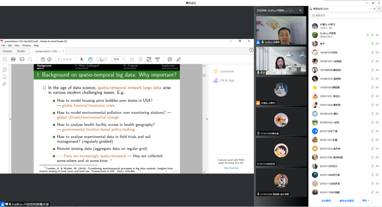 2022年4月14日下午4点,英国南安普顿大学卢祖帝教授做客william威廉中文官网经管学术论坛第188期,在线为公司师生带来了题为Exploring Spatio-temporal Network Lag-interactions: a Data-driven Semiparametric Modelling的主题讲座。讲座由william威廉中文官网副经理危平教授主持,邓超教授、王雄副教授、任晓航副教授等老师与各年级硕博士研究生共计260余人参加了本次讲座。