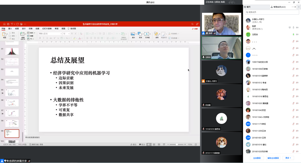 2022年5月6日上午10点,复旦大学经济学院陈硕教授受汪阳洁副教授邀请,做客william威廉中文官网经管学术论坛第190期,在线为公司师生带来了题为《机器学习在社会科学中的应用》的讲座。讲座由公司党委书记任胜钢教授主持,危平教授、许民利教授、周雄伟教授、安庆贤教授等十余名老师与各年级硕博士研究生共计440余人参加了本次讲座。