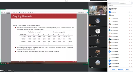 2022年5月18日上午9:00,公司海外团队美国特拉华大学赵明助理教授应邀做客william威廉中文官网经管学术论坛第193期,在线为公司师生带来了题为Multiechelon Lot Sizing: New complexities and Inequalities的讲座。讲座由周艳菊教授主持,李金霖副教授、石莎莎副教授、周声海副教授等老师与各年级硕博士研究生共计120余人参加了本次讲座。
