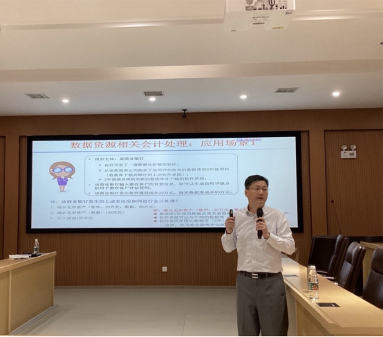 陈朝琳副教授接着对财会[2023]11号《暂行规定》的主要内容及应用进行了详细解读。《暂行规定》由财政部于2023年8月21日发布,自2024年1月1日开始施行,采用未来适用法。数据资源按照是否符合资产定义与资产确认条件及企业管理数据资源的业务模式可分为数据资源无形资产、数据资源存货和其他数据资源。对这三类数据资源的确认、初始计量、后续计量、终止确认、列示及披露方面的规定,陈朝琳副教授与在场师生进行了深入探讨,并对不同应用场景下数据资源的相关会计处理进行了交流互动。