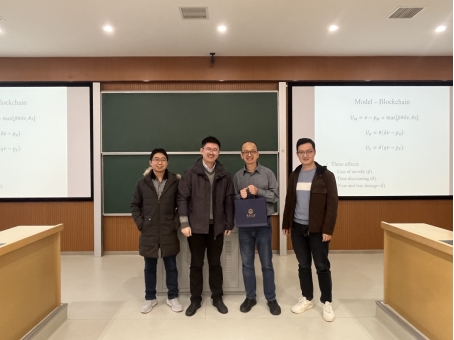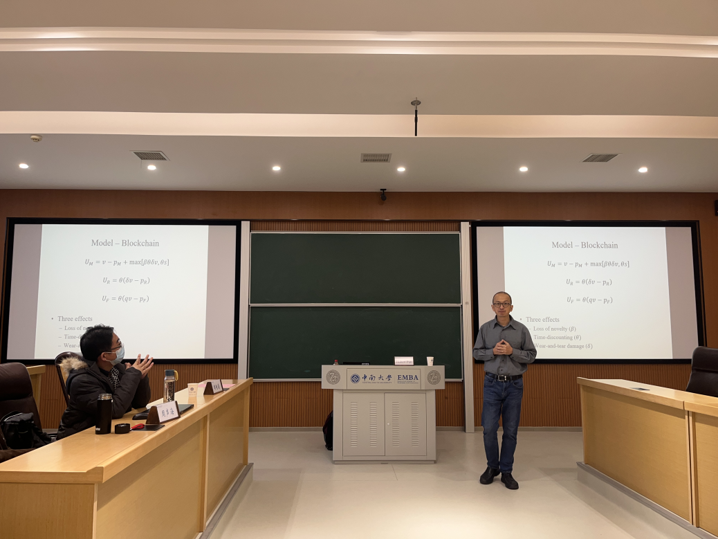 提问环节,参会师生就第一期市场存在假冒产品、区块链采用时机决策、区块链使用成本、二级市场均衡分析和消费者剩余等问题展开了激烈讨论。周声海副教授基于第一期市场存在假冒产品的现实情况与Hubert PUN副教授讨论模型结论的稳健性问题。卫立群老师与Hubert PUN副教授交流了区块链采用的时机决策问题。