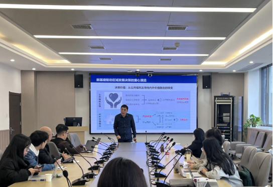 随后,刘教授对其最新申报的一个项目进行了详细的介绍。首先,刘教授介绍了此项目的问题背景,他指出,区域经济社会发展不平衡不充分的问题非常突出,集中体现为产业、要素、结构、制度等因素在空间和时间尺度上的不平衡不充分。由此,他从要素分配、产业结构、比较优势三个视角出发,向大家介绍了新型基础设施较传统基建的优势,并总结道“新基建已经成为破解区域发展不平衡不充分问题的重要“时代抓手”,是促进区域平衡充分发展的新引擎”。紧接着,刘教授对新基建的特点、潜在风险、其他限制、新基建高质量决策的必要性以及新基建在决策过程中的差异性进行了详细的讲解,自此,在场师生对此项目背景有了全方面的理解。同时,刘教授从决策属性、问题、主体、过程、尺度以及目标等方面出发,细致讲解了其各自的决策内涵与特征,使得大家对新基建决策的内涵与原理有了更为深入的理解。