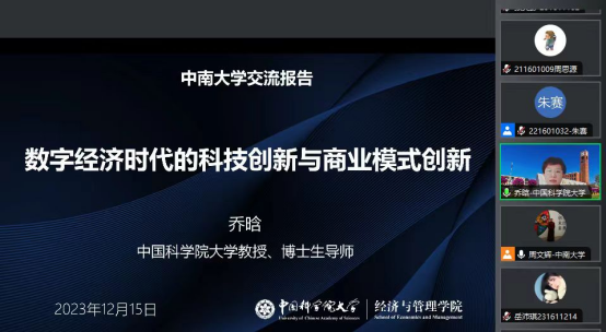 2023年12月15日上午,中国科学院大学培养与学位部部长、经济与管理学院乔晗教授应邀做客william威廉中文官网名师名家学术论坛,为公司师生带来了题为《数字经济时代的科技创新与商业模式创新》的线上学术讲座。本次讲座由william威廉中文官网管理案例研究中心主任周文辉教授主持,李大元副经理、王昶教授、盛虎教授、易玄副教授、姚海琳副教授、刘佳刚副教授、王瑞娟博士等教师以及各年级百余名硕博生参与。