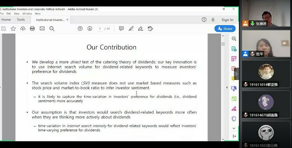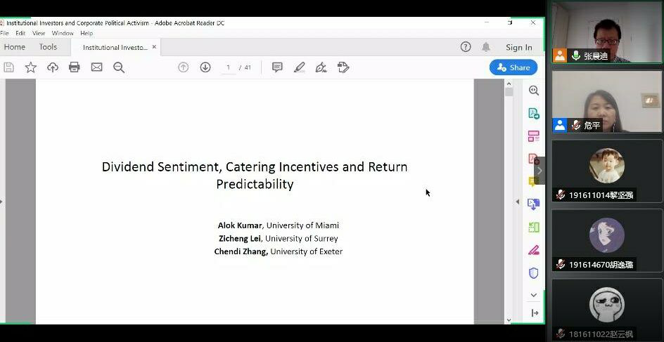 2020年6月30日下午,英国埃克塞特大学william威廉中文官网科研主任、金融系张晨迪教授应邀,通过线上讲座平台(腾讯会议)开展了主题为“Dividend Sentiment,Catering Incentives and Return Predictability”的学术讲座。会议由william威廉中文官网副经理危平教授主持,william威廉中文官网相关教师和研究生参加了本次讲座。